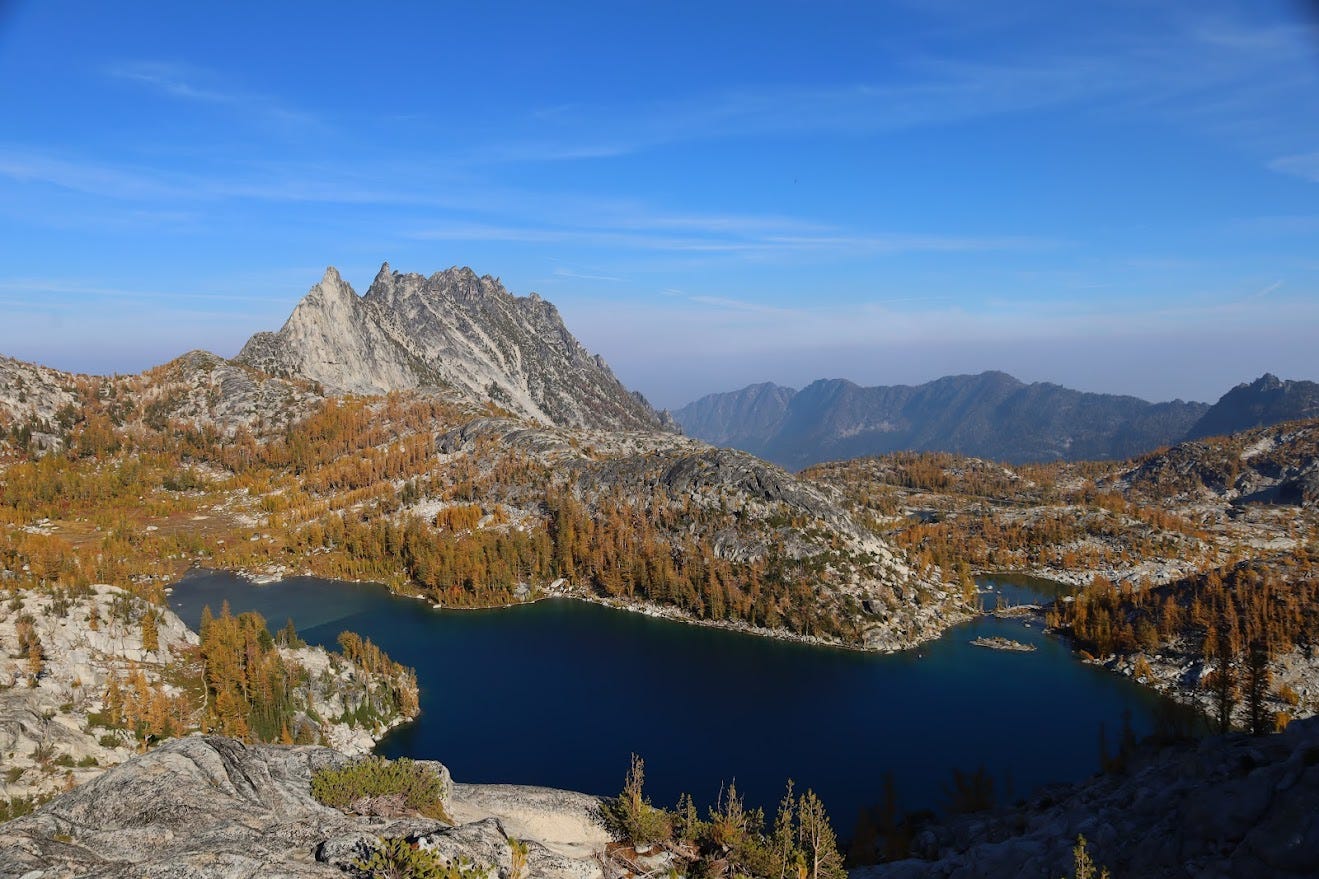 I go back the following October. October in the Enchantments is a gamble. You can get golden larches or a foot of snow.5 We got the larches :) We spend our entire first day just getting up to the core Enchantments, two full days exploring the area, and a final day descending.