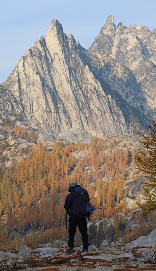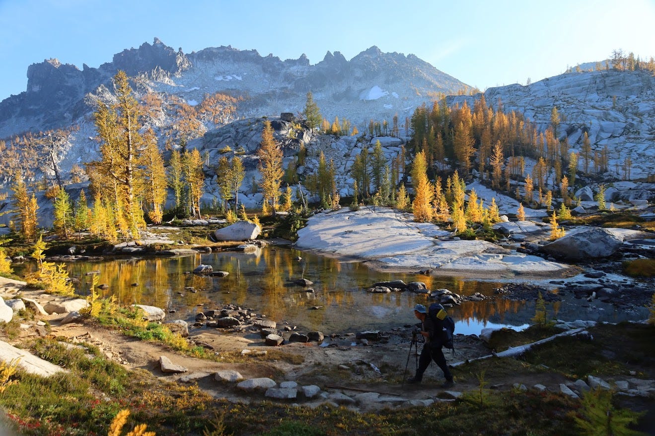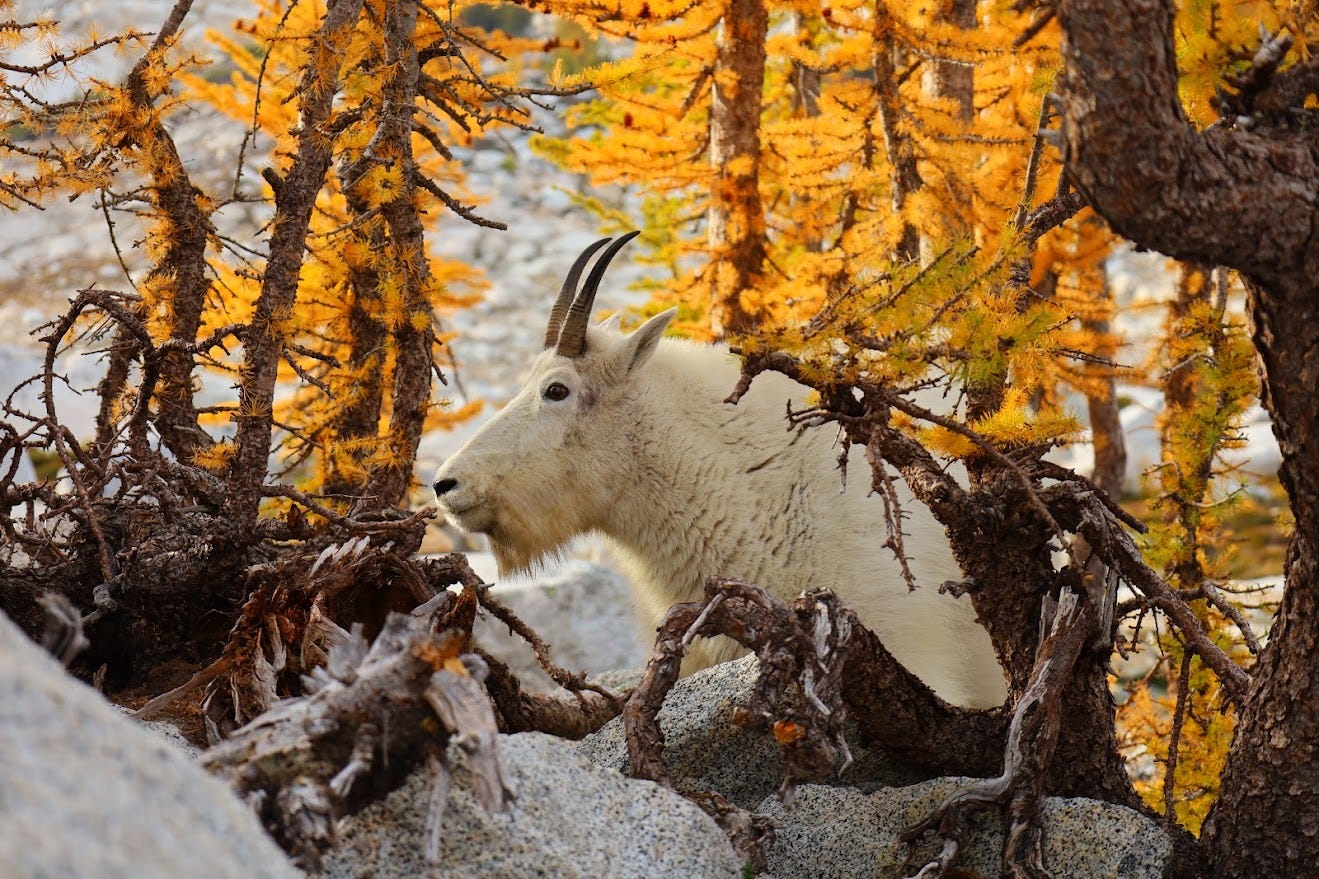 During the dark days of December 2020, I was spending my life studying for the LSAT and ordering takeout.1 One night, after a long day of solving logic puzzles, I came across a photo from a hike called “The Enchantments.” Spotless white goats were chilling amongst a forest of gold. A flaming red sunset contrasted against rainy Seattle and a life of practice exams.
