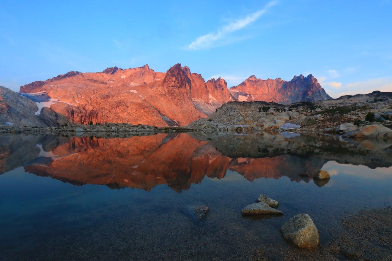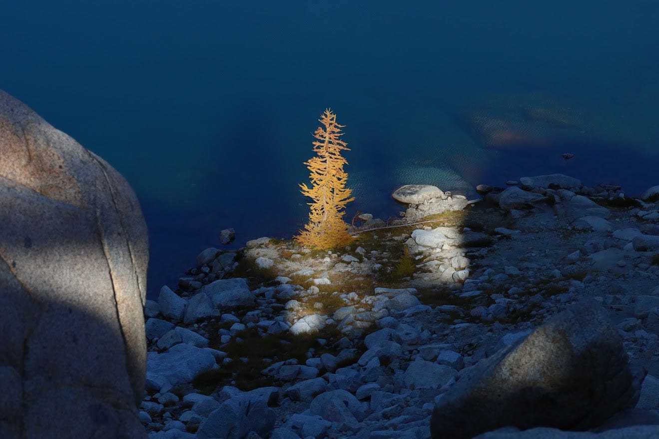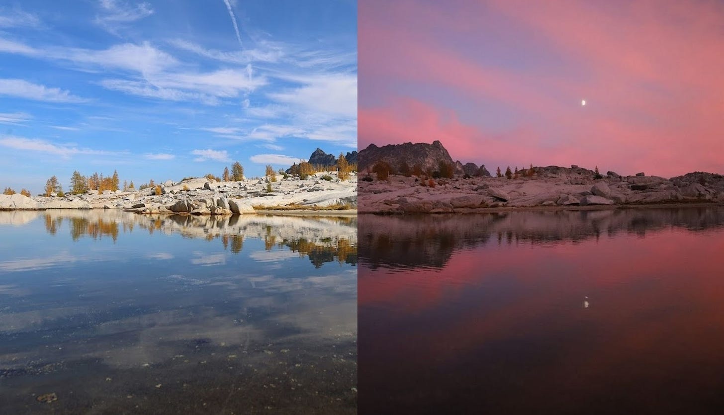 During the dark days of December 2020, I was spending my life studying for the LSAT and ordering takeout.1 One night, after a long day of solving logic puzzles, I came across a photo from a hike called “The Enchantments.” Spotless white goats were chilling amongst a forest of gold. A flaming red sunset contrasted against rainy Seattle and a life of practice exams.